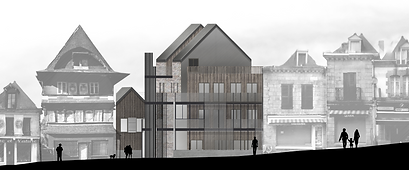 Sur le parcellaire laniéré propre à l’ilôt central, nous proposons de requalifier le front de rue et la dent creuse apparue suite à une démolition, et de densifier l’arrière de la passerelle tout en préservant la spécificité bâti/jardin du centre bourg.
